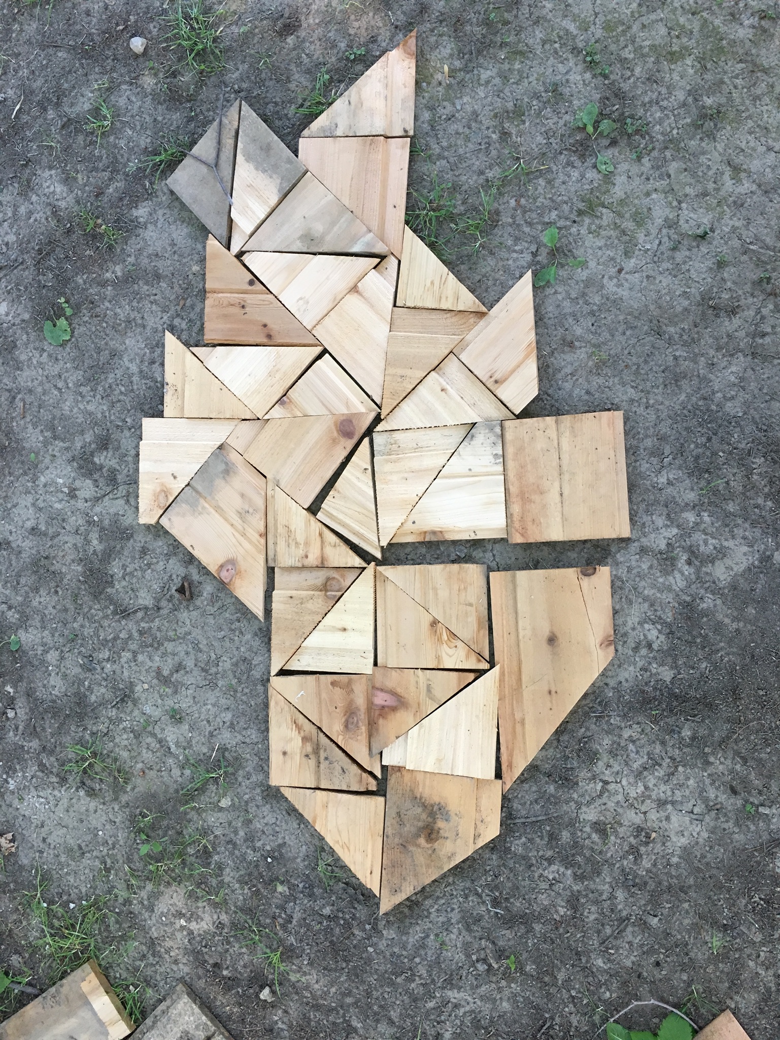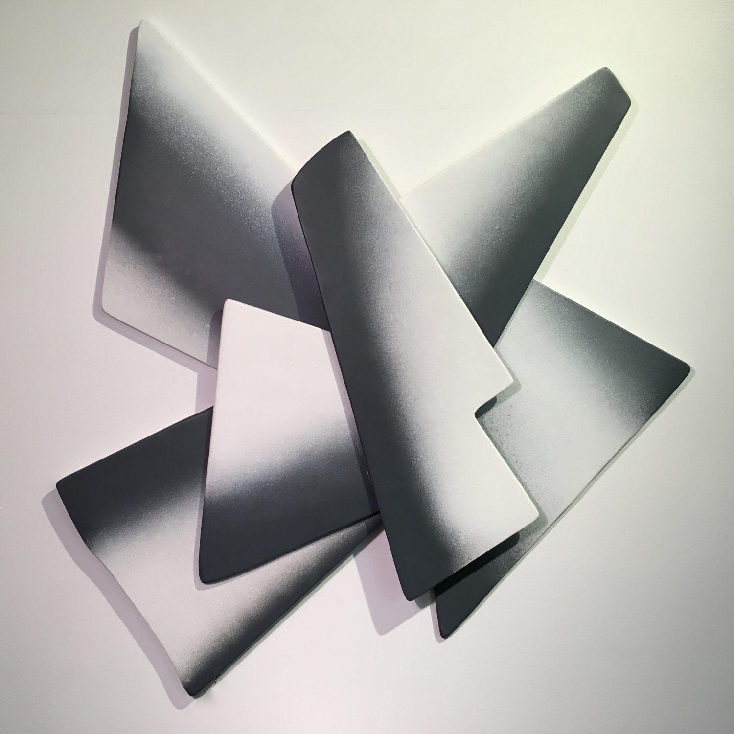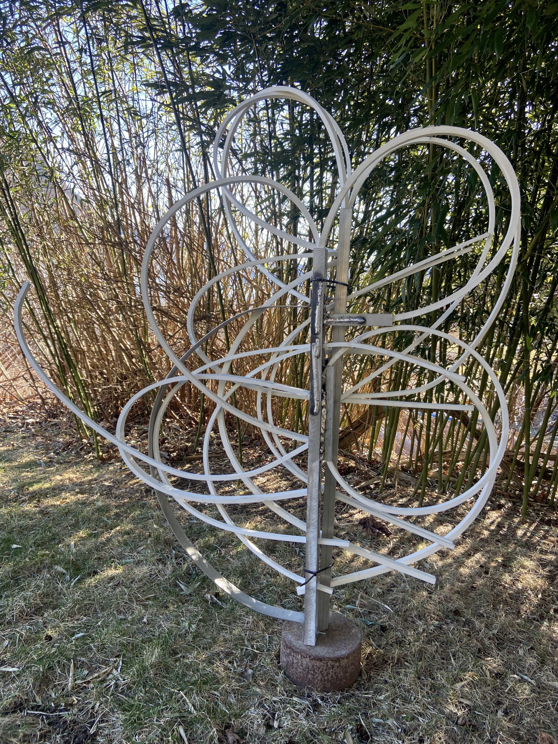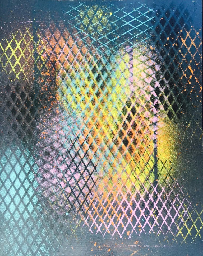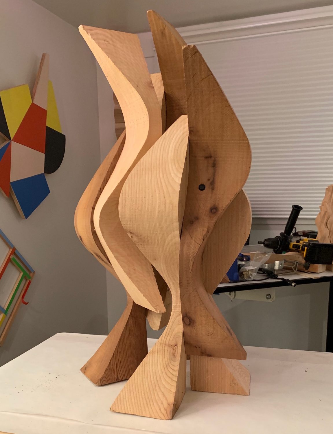 This is an assemblage of flat 1/4” luan plywood pieces. I shaped them with a scroll saw and finally, finally sanded them smooth after learning about using wood filler and sanding sealer on luan. It’s very grainy and splintery. Then I painted the pieces with Montana acrylic spray paint and glued them all together.